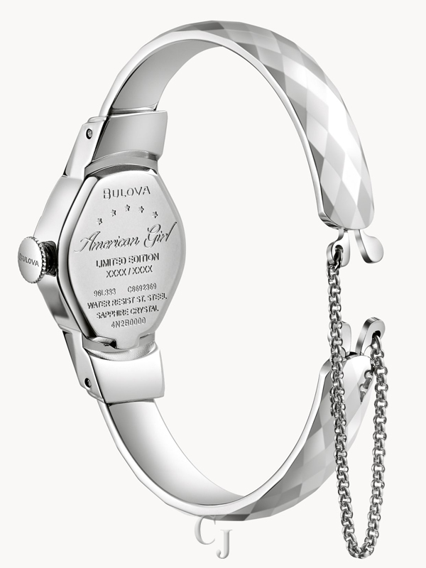 Striking a delicate balance of femininity and powerful charm, our new American Girl “M” timepiece is inspired by the original ladies’ design from 1957 that was coined “a superb Bulova watch and a magnificent bracelet in one glamorous ensemble,” and has become an instant style sensation. Reimagined from the Bulova Archives with a new elegance, the limited-edition American Girl timepiece features a faceted silver-tone stainless steel design with a petite tonneau-shaped case finished with a double-domed sapphire crystal and a white dial with blue minute and hour hands. The faceted bangle features jewelry tongue-in-groove clasps complete with a 65mm chain extender to ensure a secure fit for small to larger wrists. Channel timeless chic with this must-have accessory. Limited to 3,000 numbered pieces worldwide and presented in an elegant red keepsake box with white satin lining.