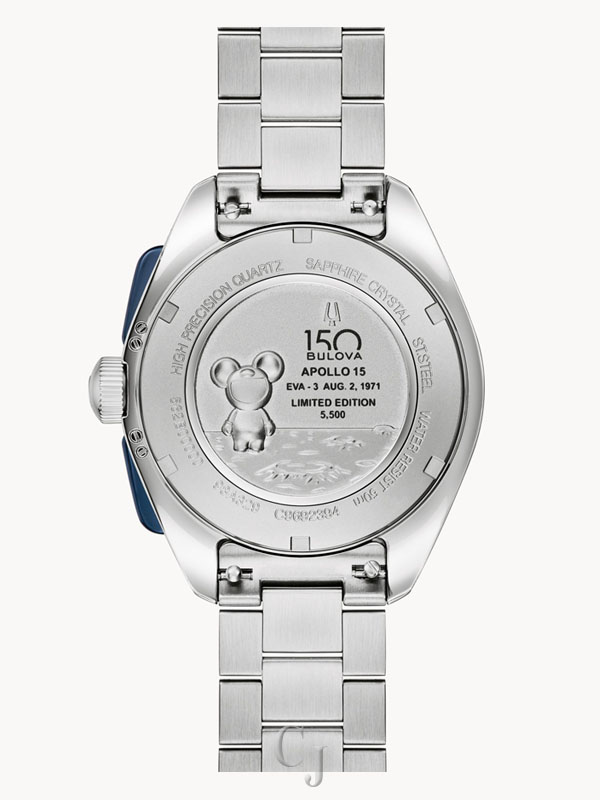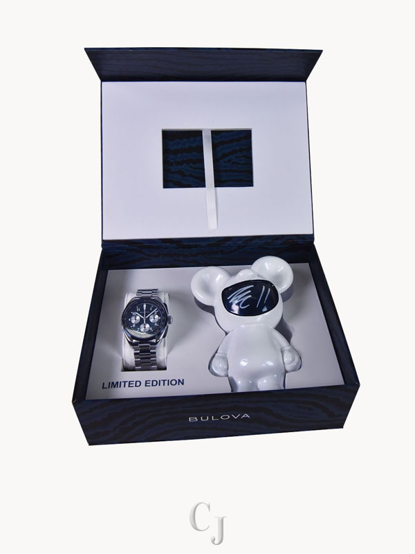 In collaboration with famed Brazilian artist Thiago Rosinhole, Bulova’s legendary Lunar Pilot chronograph is revisited for Bulova’s 150th Anniversary, combining Bulova’s legacy of precision timing with Rosinhole’s unique style of fusing street art and pop culture for this new limited-edition Lunar Pilot timepiece. Beneath the flat sapphire crystal, the watch takes a striking turn with a mesmerizing Timascus dial, crafted from titanium that has been folded through the Damascus process to achieve its captivating pattern. Slim, blue chronograph pushers and a crown featuring the Bulova tuning fork accent the 43.5mm silver-tone stainless steel case, while six-hand chronograph functionality with timing to 1/20th second, silver registers, and Super-Luminova applied to the hands and markers complement the dial’s blue tachymeter ring. Powered by our proprietary high-precision quartz movement, resonating at a frequency of 262khz for unparalleled accuracy and allowing a sweeping chronograph hand , the watch is paired with a matching 3-link silver-tone stainless steel bracelet and features an individually numbered case back embossed with Rosinhole’s signature Budii figure. A modern interpretation of a historic timepiece with a unique twist, the Bulova Lunar Pilot is the ideal watch for today’s explorer and is presented in special packaging, including a storybook and a signature 6-inch Budii figurine designed by the celebrated artist, exclusively for this collaboration. Limited to 5,500 pieces worldwide.