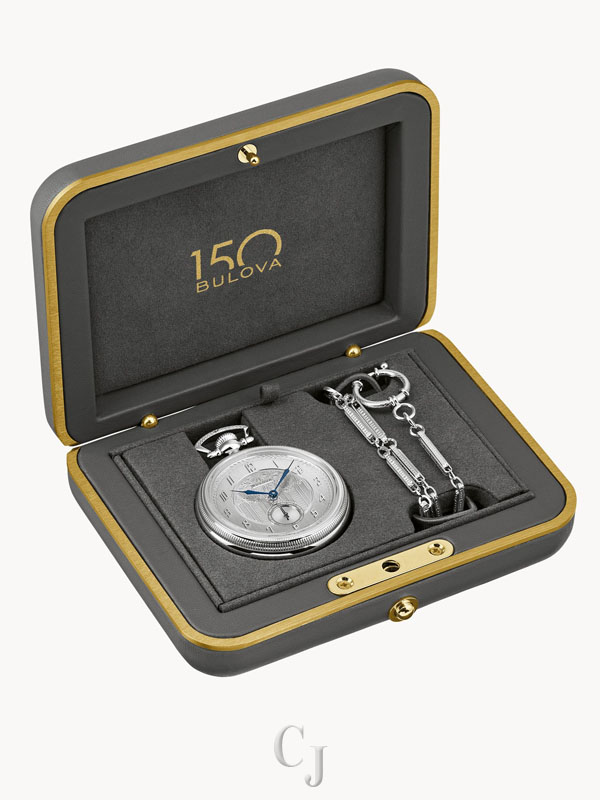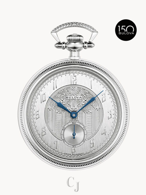 The Limited Edition Bulova Pocket Watch from the Archive Series takes inspiration from several Art Deco designs from the 1920s, celebrating the artistic craftsmanship that has long defined Bulova. The pocket watch features a coin-edge textured silver-tone stainless steel case with a textured bow and is finished with a sapphire crystal. The 15.8″ custom link chain was inspired by the original vintage pocket watch and is finished with a lobster claw and spring ring that was specially created for this timepiece. The stunning sterling silver dial reproduces the incredible work of early Bulova artisans with blue hands, intricately engraved central artwork, and dramatic numerals set against a brushed hour ring. The case back is etched with the 150th anniversary logo and is individually numbered to mark each limited-edition piece. In tribute to Bulova’s history of ambitious watchmaking, the timepiece is powered by a self-winding Swiss mechanical movement with 21 jewels and a 62-hour power reserve. Commemorate Bulova’s story and its place in American history with this exceptional pocket watch. Presented in a luxurious custom case complete with a storybook honoring our Art Deco heritage. Limited to 350 pieces worldwide.