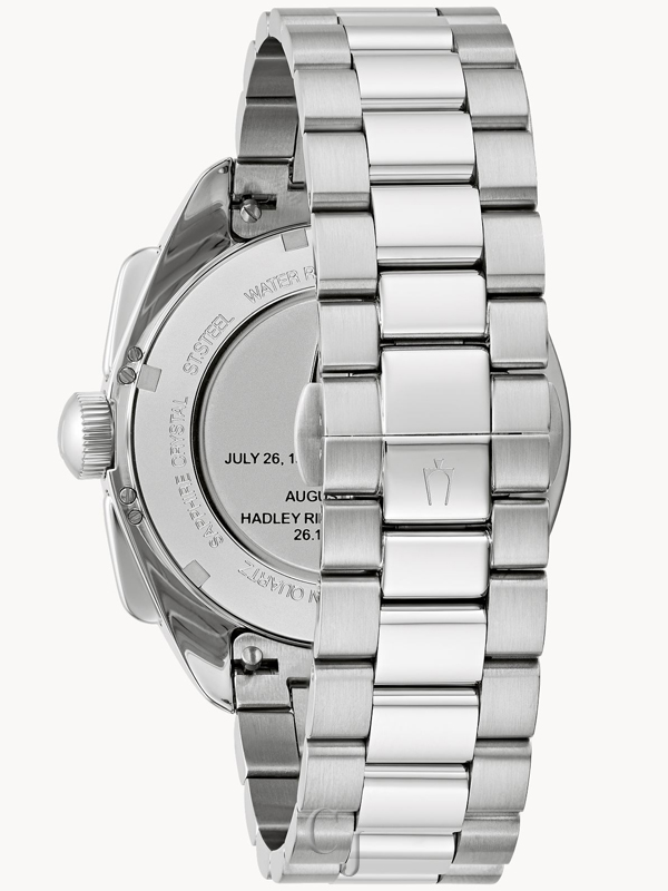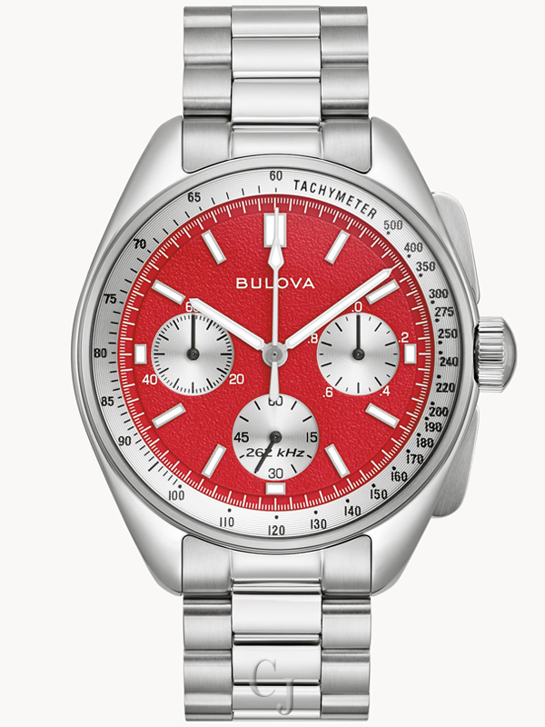 On August 2, 1971, a Bulova chronograph was worn on the moon, engineered by Bulova for the demands of the lunar environment. Now, the iconic design has been updated with our exclusive high precision quartz movement. Continuing Bulova’s legacy of precision timing with heritage-inspired design, the Lunar Pilot chronograph from the Archive Series features a unique dial that reinforces our spacefaring history, and the 43.5mm silver-tone 316L stainless steel polished case, creating a dynamic presence on the wrist. Slim chronograph pushers and a crown featuring the Bulova tuning fork logo are perfectly proportioned and ideally positioned at 3 o’clock. Under the flat sapphire crystal, the six-hand chronograph dial is presented in a unique red and silver “panda” style, with a vibrant red inspired by the tone of the moon during a total lunar eclipse, sometimes referred to as a “blood moon.” A silver-white tachymeter ring offers contrast around the dial, which features a retro Bulova logo. The slim hands and applied markers offer high legibility and are applied with super-luminous material for low-light display. The silver-white recessed, circular grooved sub-dials include a 1/20 chronograph seconds counter at 3 o’clock, running seconds with a sweep hand at 6 o’clock, and 60-minute chronograph counter at 9 o’clock. Powered by our proprietary high precision quartz technology, resonating at a frequency of 262khz for unparalleled accuracy with a sweeping chronograph hand, this exceptional men’s timepiece is paired with a matching 3-link silver-tone stainless steel bracelet with a push-button deployant clasp and an interchangeable black leather strap with red contrast stitching, both of which feature an easy release system for quick changes. The Lunar Pilot chronograph brings the past to the present with a design from space exploration history, perfect for the modern adventurer.