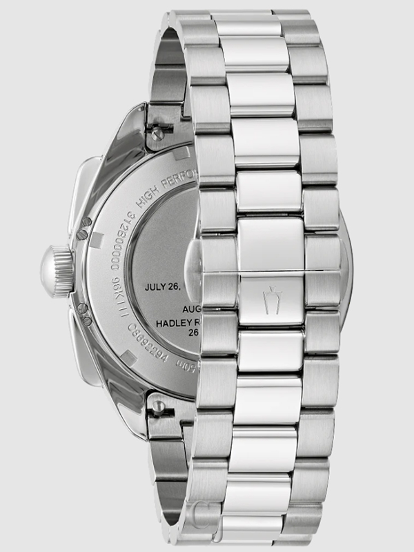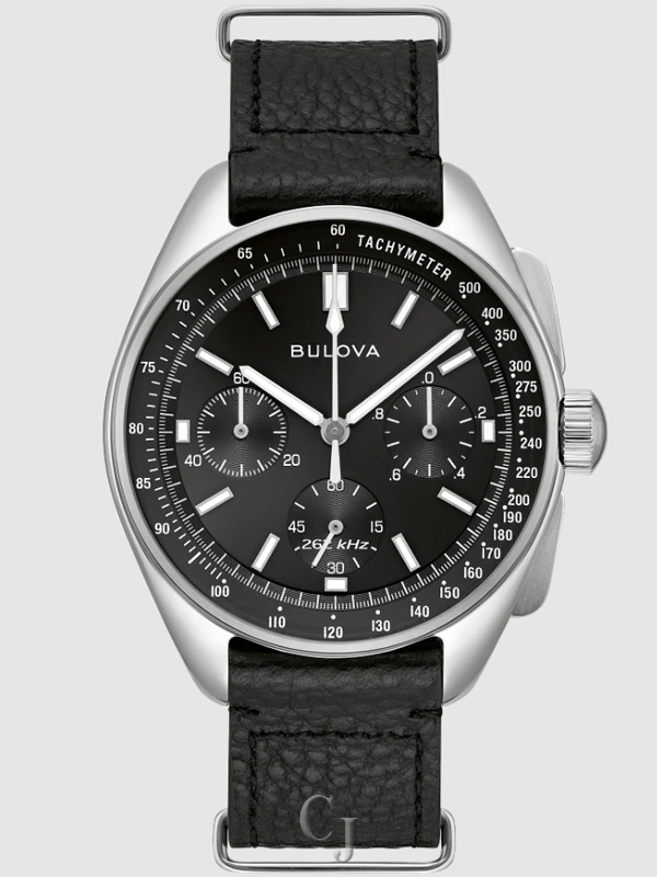 On August 2, 1971, a Bulova chronograph was worn on the moon, engineered by Bulova for the demands of the lunar environment. Now, Bulova returns to the design and updates it with an exclusive high precision quartz movement, continuing its legacy of precision timing with the men’s Bulova Lunar Pilot chronograph from the Archive Series. The Lunar Pilot chronograph features the same 43.5mm silver-tone stainless steel case as the original Bulova Lunar Pilot chronograph. Slim chronograph pushers and a crown featuring the Bulova tuning fork logo are positioned at 3 o’clock. Under the flat sapphire crystal, the six-hand chronograph dial is rendered in a deep black evocative of space, with stark white accents including the tachymeter ring and retro Bulova logo. The slim hands and applied markers offer exceptional legibility and are applied with super luminova for low-light display. The recessed, circular grooved sub-dials include a 1/20 chronograph seconds counter at 3 o’clock, running seconds at 6 o’clock, and a 60-minute chronograph counter at 9 o’clock. The Lunar Pilot is powered by Bulova’s proprietary high precision quartz movement, resonating at a frequency of 262khz for unparalleled accuracy. The watch is paired with a matching 3-link silver-tone stainless steel bracelet with a push-button deployant clasp and a NATO leather strap, both of which feature an easy release system for quick changes. The Bulova Lunar Pilot brings the past to the present with a design from space exploration history, perfect for the modern adventurer.