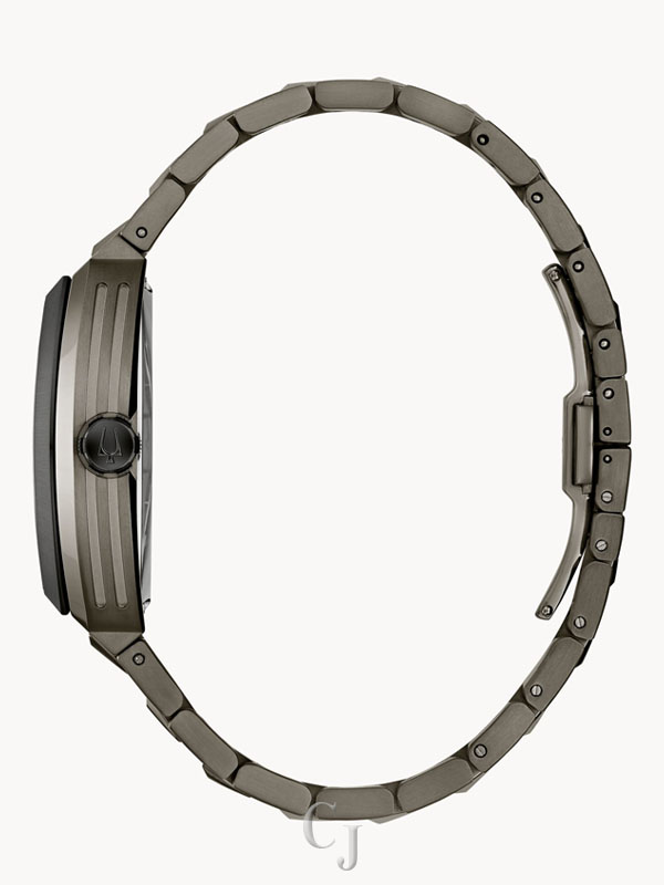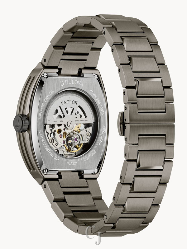 This Bulova men’s watch from the Maquina collection offers daringly avant-garde design. The watch features a 40mm gun metal- and black-tone stainless steel case with a curved sapphire crystal and a gun metal-tone stainless steel bracelet with a push-button deployant closure. The green patterned dial with black dial ring and bridges has black hands and silver-tone markers with luminescent fill, with a central aperture revealing the inner workings of the 21-jewel automatic, also visible through a transparent case back, skeletonized movement which has a 42-hour power reserve. With its mechanical heart and unrivaled modern form, this Bulova men’s timepiece offers a uniquely individual expression of style.