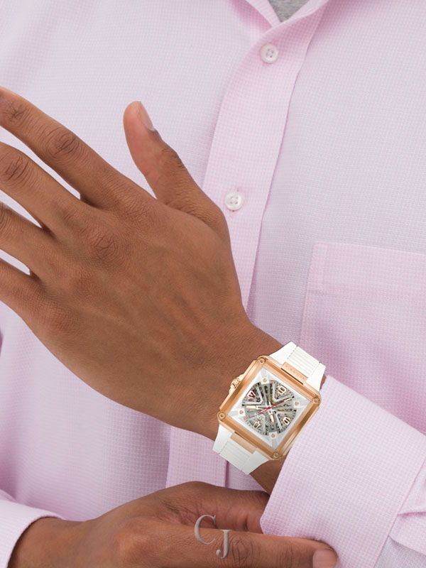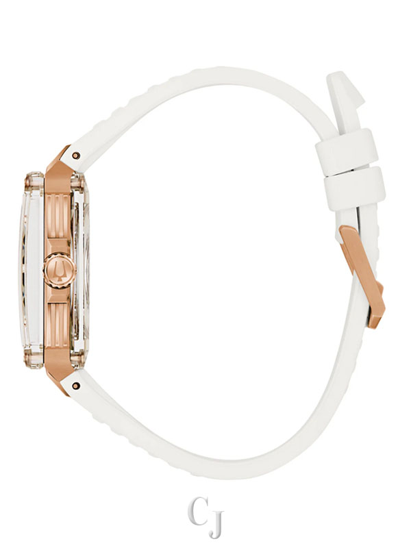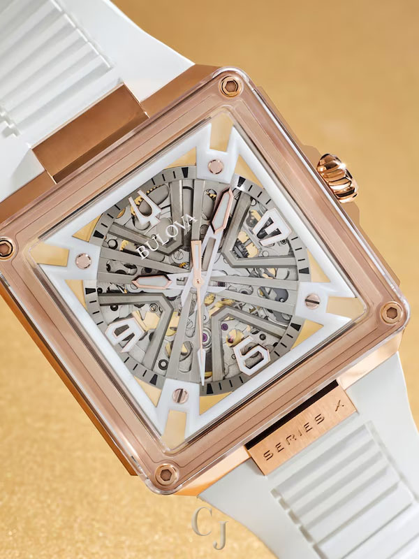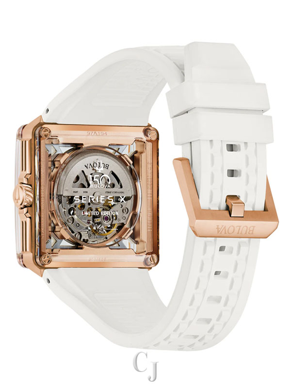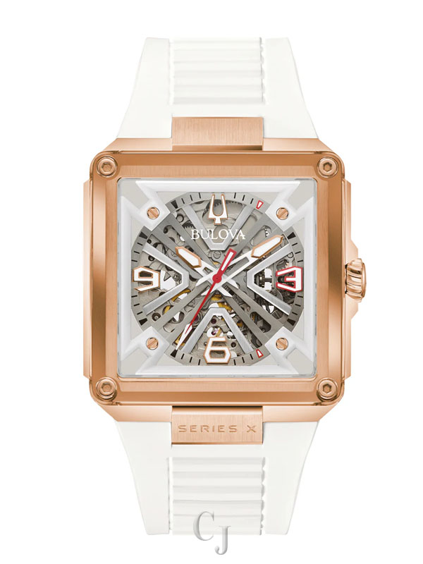 A stunning celebration of Bulova’s 150 years of mastering the craft of luxury watchmaking, the Bulova men’s Series X watch injects the flair of legendary musical artist Marc Anthony into a groundbreaking design. The unique case is constructed in three layers, with a rose gold-tone stainless steel midcase secured between two edge-to-edge sapphire crystals. The dial features silver-tone accents and two-tone hands with luminescent fill, while the 1, 3, and 5 markers are highlight for their personal significance to Marc Anthony. The skeletonized automatic movement is visible through both crystals and offers a 42-hour power reserve, while the caseback crystal features a special 150th Anniversary design. Perfectly paired with a white rubber strap, this Bulova men’s Series X watch is a showstopping tribute to Bulova’s history and Marc Anthony’s artistry.