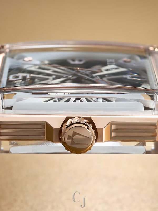 - Three-layer build: A rose gold-tone stainless steel midcase sandwiched between two edge-to-edge sapphire crystals
