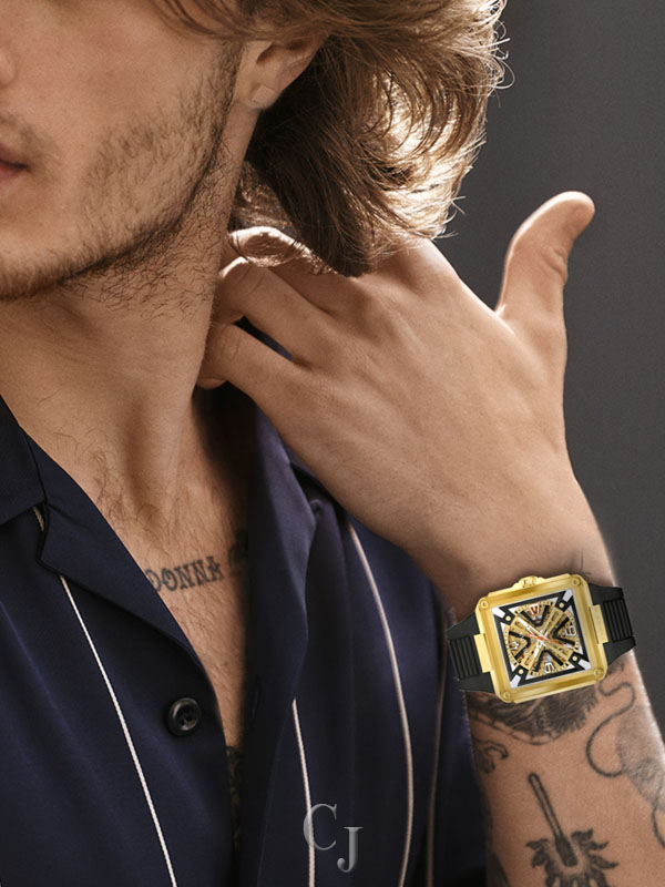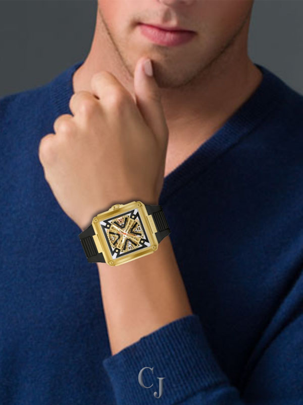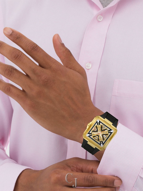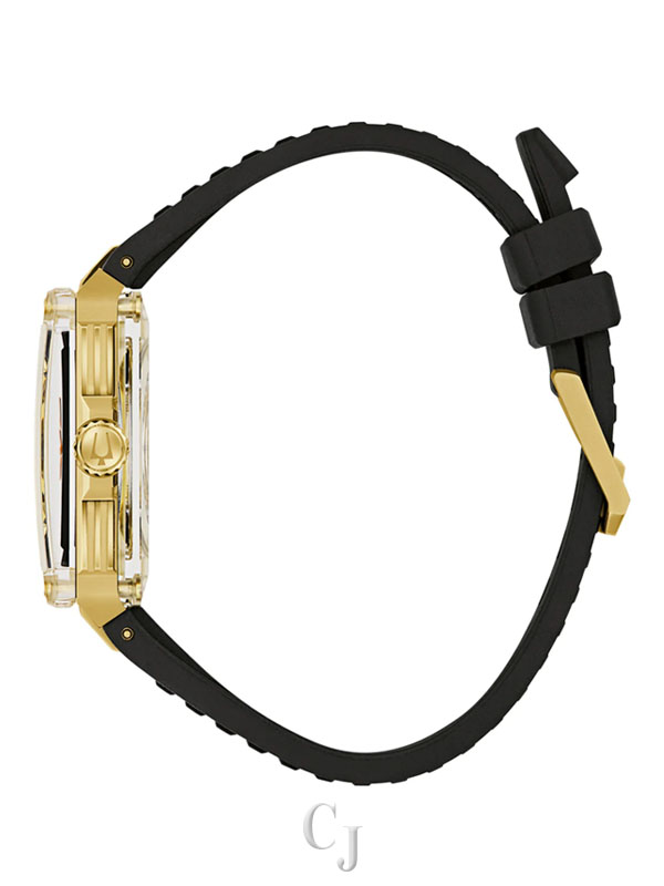 A stunning celebration of Bulova’s 150 years of mastering the craft of luxury watchmaking, the Bulova men’s Series X watch injects the flair of legendary musical artist Marc Anthony into a groundbreaking design. The unique case is constructed in three layers, with a gold-tone stainless steel midcase secured between two edge-to-edge sapphire crystals. The dial features black and gold-tone accents and two-tone hands with luminescent fill, while the 1, 3, and 5 markers are highlight for their personal significance to Marc Anthony. The gold-tone skeletonized automatic movement is visible through both crystals and offers a 42-hour power reserve, while the case back crystal features a special 150th Anniversary design. Perfectly paired with a matching rubber strap, this Bulova men’s Series X watch is a showstopping tribute to Bulova’s history and Marc Anthony’s artistry.
