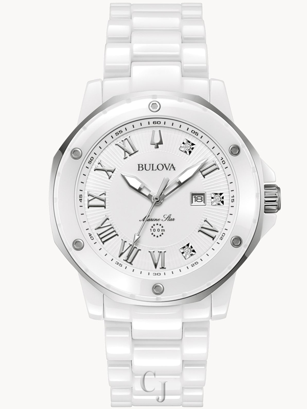BULOVA MARINE STAR MARC ANTHONY WHITE DIAL CERAMIC BRACELET WOMEN’S WATCH 98P222