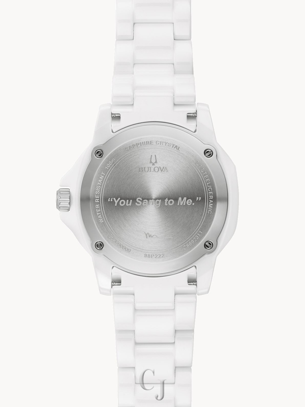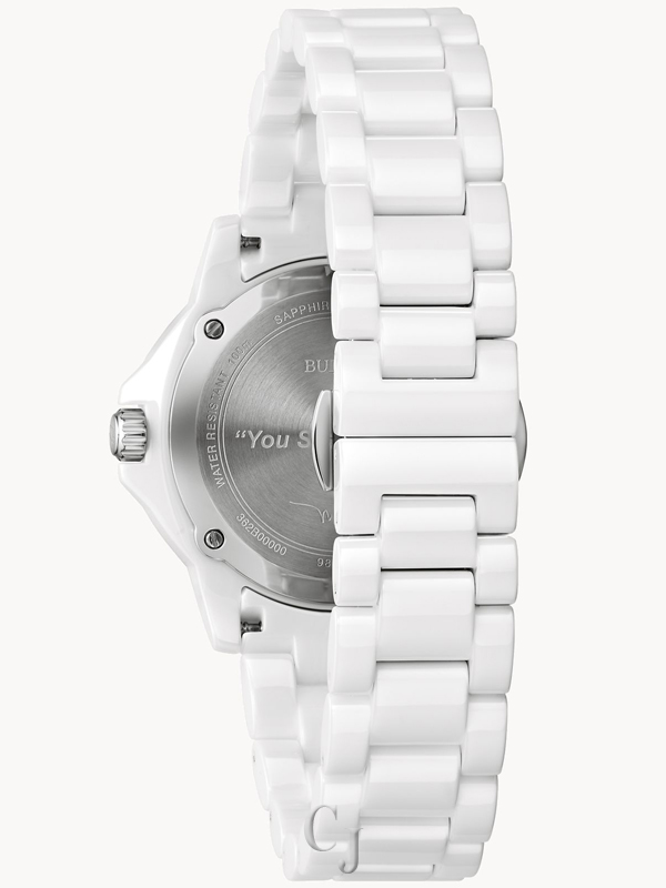 Capture the bright, spirited rhythm of Marc Anthony’s iconic music with this all-new Bulova ladies’ timepiece, crafted in collaboration with the legendary singer to create the perfect summer companion. The refreshingly bright case is made from polished white ceramic and silver-tone stainless steel, while 100m of water resistance offers the reliability you need from the beach to the trail. The all-white dial features a date window, luminescent hands, and roman numerals accented by three diamond hour markers at 1, 3, and 5 o’clock, numbers chosen by Anthony for their personal significance. Completing this beach-ready watch is a white ceramic bracelet with a deployant clasp with pushers for a secure, comfortable fit. For all your seaside outings, reach for this ladies’ timepiece from Bulova’s exciting collaboration with Marc Anthony.
