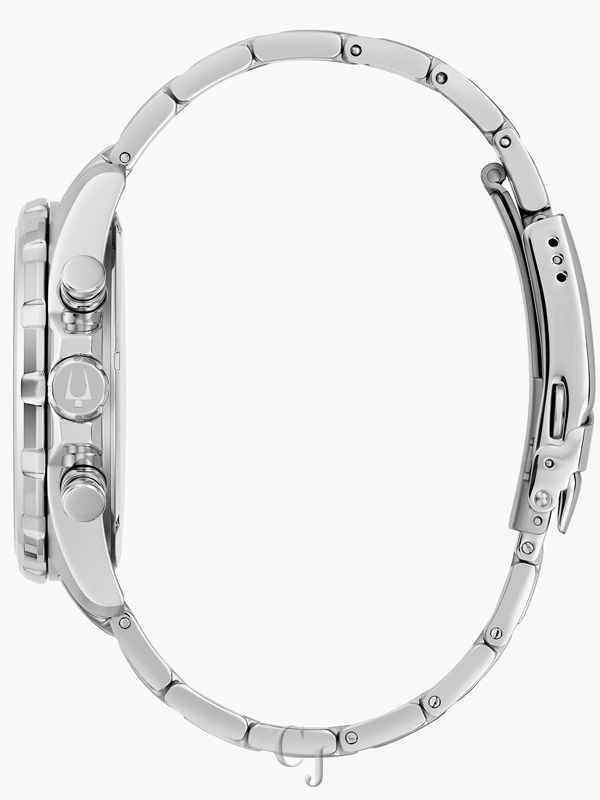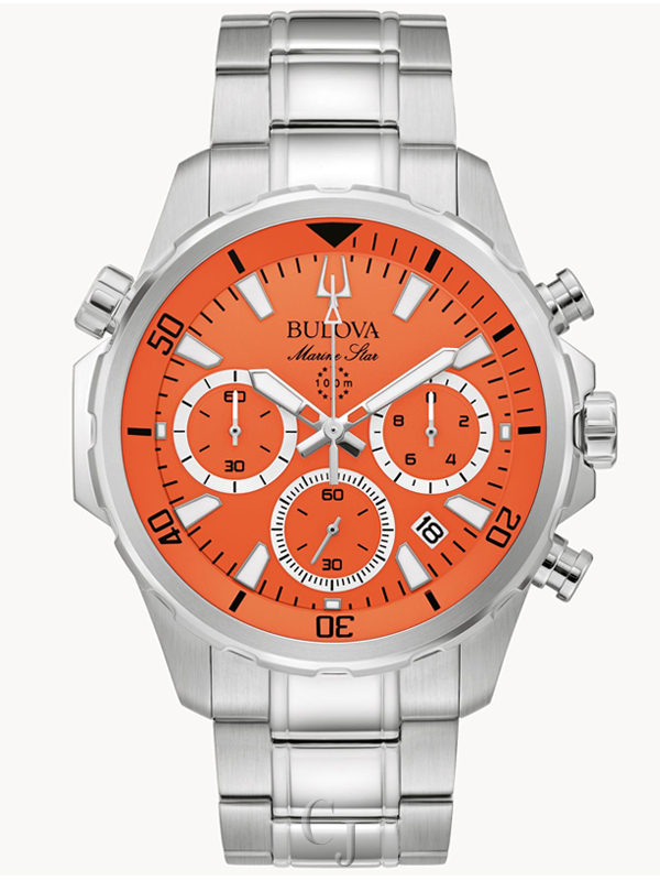 This new Bulova men’s six-hand chronograph watch from the Marine Star Collection delivers the vibrancy of the sea with the ruggedness required by those who wish to explore it. The silver-tone stainless steel case features a balance of brushed and polished facets, a flat mineral crystal, and a pull-out crown achieving 100m water resistance. The dial is a refreshing burst of orange with black accents, inspired by vintage Bulova timepieces, featuring silver-tone polished stainless steel hands and applied markers, all of which have been treated with luminescent material for low-light legibility. The dial features a running seconds sub-dial, with a central chronograph seconds hand and 60-minute and 1/20 seconds chronograph sub-dials. The dial is completed with an internal rotating 60-minute timing case ringl, operated by the crown at 10 o’clock. The watch is fitted with a matching silver-tone stainless steel bracelet with brushed and polished finishing and an extendable sport foldover clasp with pushers and a safety bar. Calling to mind marine life and equipped with the functionality befitting an explorer, this Bulova men’s timepiece is ideal for the seafaring adventurer.