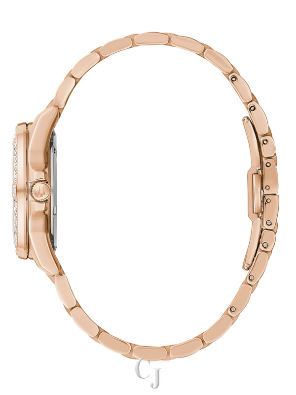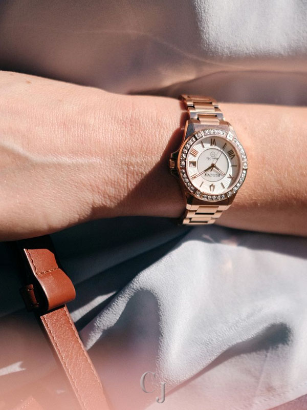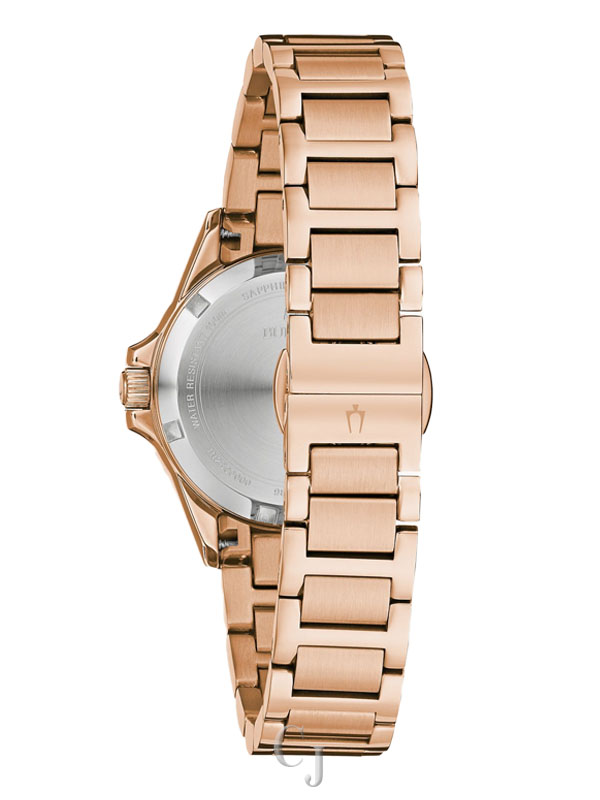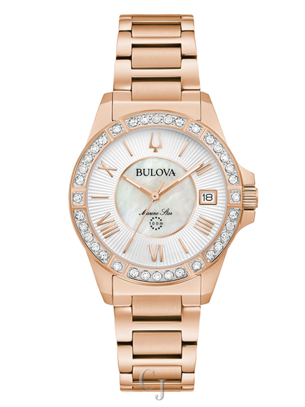 From the Marine Star collection, get swept away in the effortless elegance of this richly detailed women’s timepiece with a rose gold-tone stainless steel case and bracelet. The case features 24 individually hand set diamonds on a rose gold-tone bezel and is finished with a sapphire crystal and a white mother-of-pearl dial. Also featuring a deployant clasp closure and water resistance to 100 meters, this must-have watch keeps perfect time while channeling a timeless glamour.