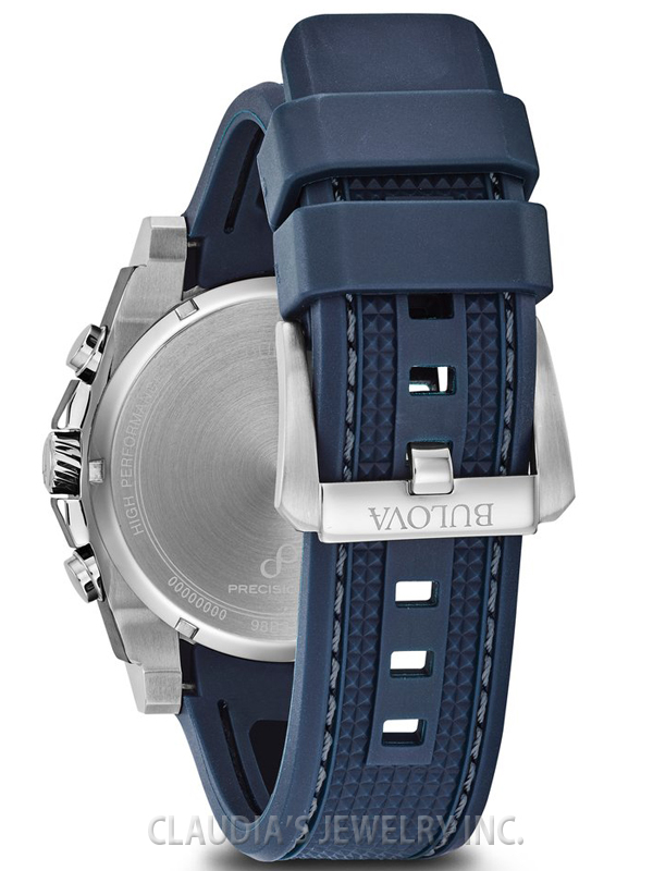Powered by Bulova™s proprietary Precisionist eight-hand quartz chronograph movement with a 262kHz vibrational frequency”eight times greater than standard timepieces”for unparalleled accuracy. Stainless steel and blue IP steel screw-back case with screw-down crown, black carbon fiber chronograph dial with date feature and red accents, curved mineral crystal, textured blue polyurethane strap with three-piece buckle closure, and 300-meter water resistance.