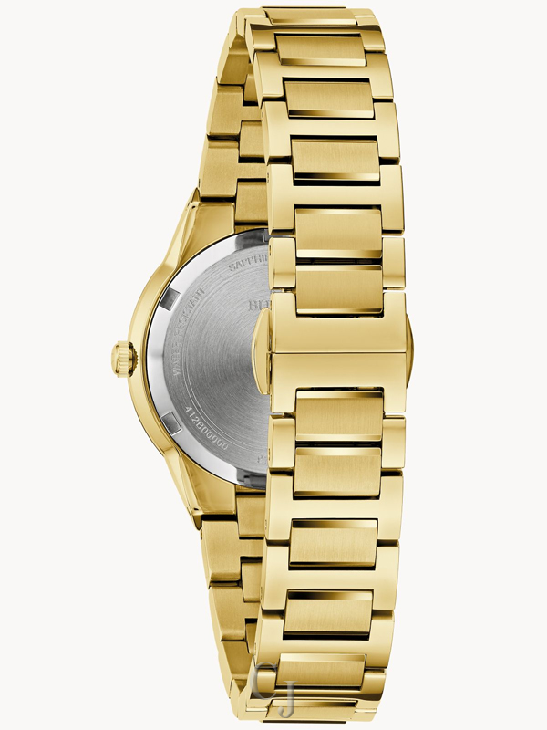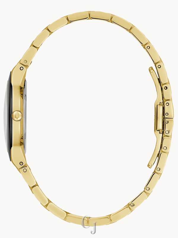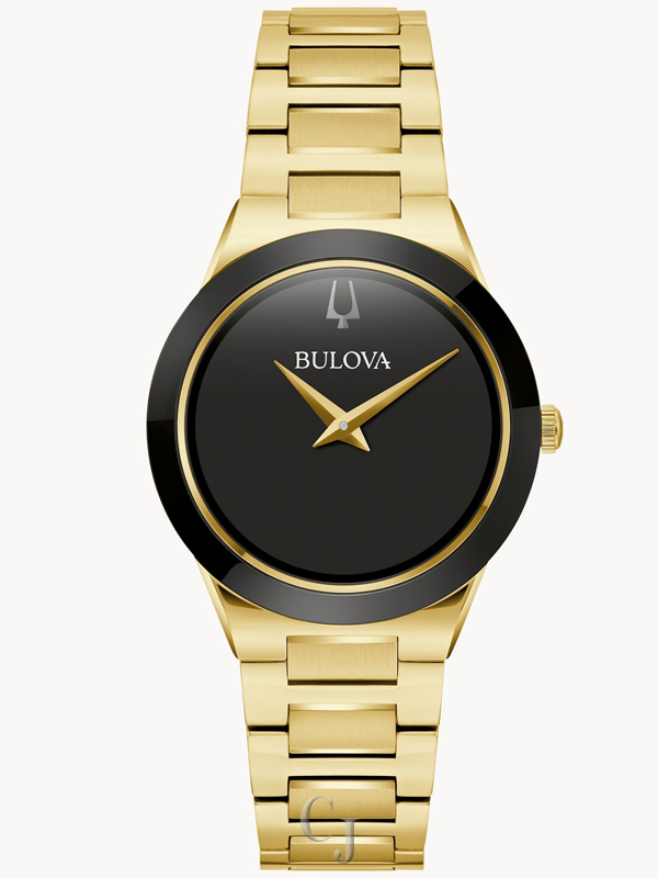 A masterclass in modern design, this sophisticated timepiece from the Bulova ladies’ Modern collection will add a contemporary edge to your style playbook. The gold-tone stainless steel case design features a metalized domed edge-to-edge sapphire crystal that extends to form the black bezel of the timepiece, while a sleek silhouette flows seamlessly into a matching gold-tone stainless steel bracelet with brushed center links and a push-button deployant closure for a sleek profile. A gold-tone case ring encircles the dramatic black dial, which pushes the limits of minimalism with no markers and angular gold-tone hands. An uncompromising commitment to modern design, this Bulova ladies’ timepiece will push any wardrobe beyond convention.