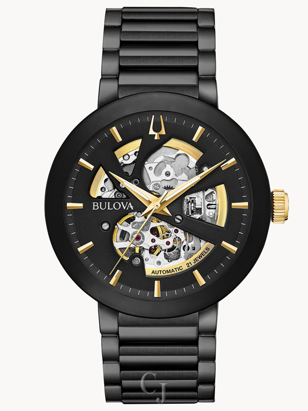 In black IP stainless steel, automatic self-winding movement with 40-hour power reserve and open aperture black dial with gold-tone accents, domed mineral glass, screw-back case, black IP stainless steel bracelet with double-press deployment closure.