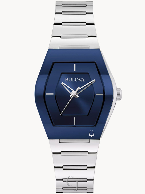 Distinctive asymmetrical tonneau shaped stainless steel case with a blue signature Futuro edge to edge curved metalized crystal features a blue dial and a stainless steel bracelet. The watch features a three-hand quartz movement, deployant buckle with pushers, and water resistance to 30 meters.