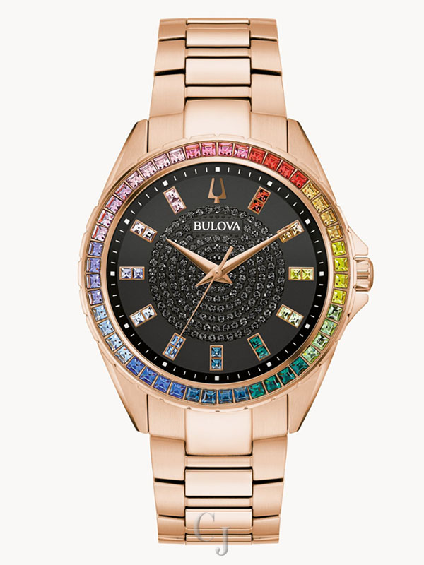 For the bold and daring of spirit and style, Bulova introduces the opulently embellished men’s Phantom timepiece from the Crystal collection. The magnificent rose gold-tone stainless steel case is set with a rainbow of colorful crystals around the bezel that dazzles in the light. The black dial features rose gold-tone hands and provides even more luster, with crystal-set hour markers to match the bezel and a richly textured crystal jet star pavé at the center. A matching rose gold-tone stainless steel bracelet offers a deployant closure. For life’s extravagant days, the new men’s Bulova Phantom from the Crystal collection is there to make a splash.