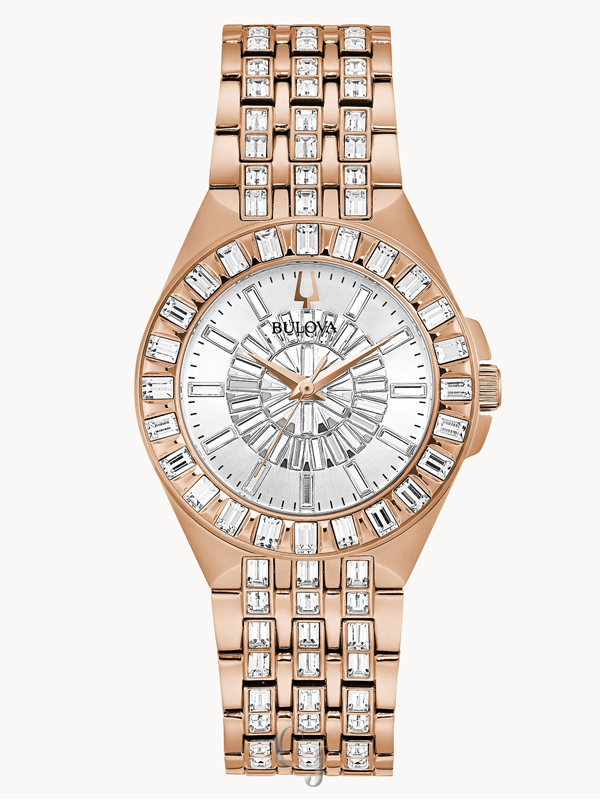 Rose gold-tone stainless steel case and bracelet and silver white pave dial embellished with 110 statement making baguette crystals. Deployant buckle, flat mineral crystal, water resistance to 30 meters.