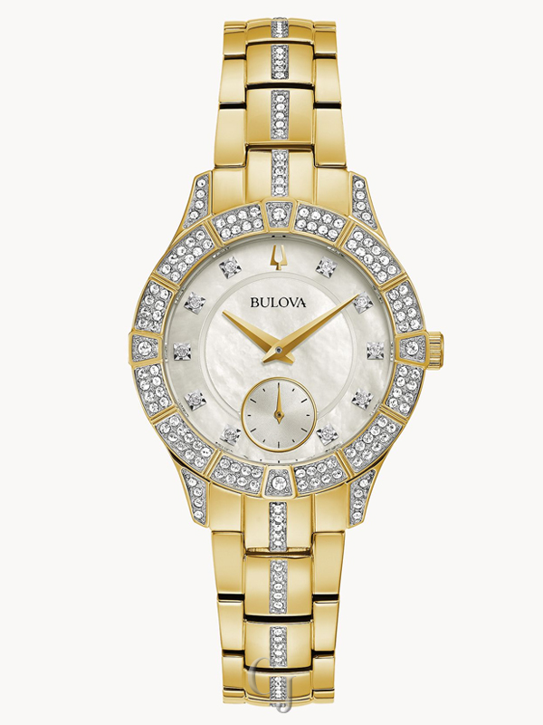 Gold-tone stainless steel case, bracelet and lustrous white mother-of-pearl dial embellished with 174 brilliant crystals. Features a three-hand sub sweep quartz movement, flat mineral crystal, and water resistance to 30 meters.