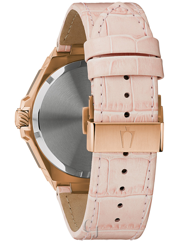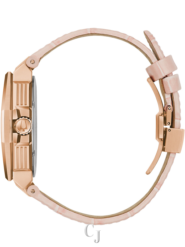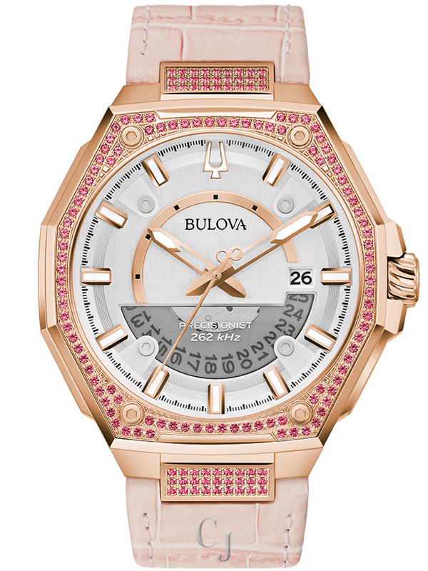 Defined by refinement and driven by innovation, this Series X timepiece balances Bulova’s most advanced technology with elegant design. The breathtaking case features rose gold-tone stainless steel and a faceted design, with a blend of polished and brushed finishes, a curved sapphire crystal with anti-reflective coating, and a bezel and strap attachment adorned with 154 radiant hand-set 1mm light rubies totaling 2.0 carats. The bold silver-white dial features a brushed finish with rose gold-tone hands and applied markers with luminescent fill, a date window, and a seconds hand with a smooth sweep. A translucent aperture in the dial offers a peek behind the curtain at the Bulova Precisionist movement, a revolutionary 8-jewel quartz mechanism accurate to 5 seconds per month and with increased resistance to temperature changes. The watch has 100m water resistance and is complemented with a pink crocodile grain leather strap with a push-button deployant clasp. An instant classic, this Bulova timepiece provides a distinguished elegance in every setting.