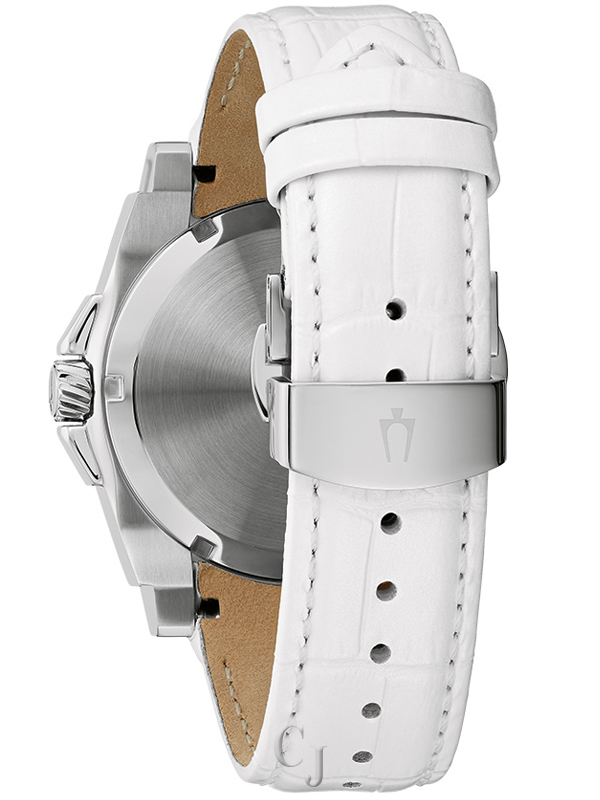 The latest model from the Champlain collection is a stunning interpretation of modern design, powered by Bulova’s most advanced movement technology. Distinguished by angular lines and pronounced facets, the 40mm silver-tone stainless steel case features a bezel hand-set with 52 dazzling 1.5mm full-cut diamonds totaling .79 ctw. The case is fitted with a curved sapphire crystal and has 100m water resistance. A radiant silver-tone dial features grooved texturing and is segmented by applied silver-tone hour markers, with silver-tone hands with luminescent fill. The sweeping seconds hand features the signature ‘P’ counterbalance, denoting the Bulova Precisionist movement that powers the timepiece. The Precisionist movement is a revolutionary 8-iewel guartz mechanism accurate to 5 seconds per month and with increased resistance to temperature changes. Complementing the design is a white crocodile grain leather strap with a push-button deployant clasp. Embrace a new level of elegance with this stunning timepiece from the Bulova Champlain collection