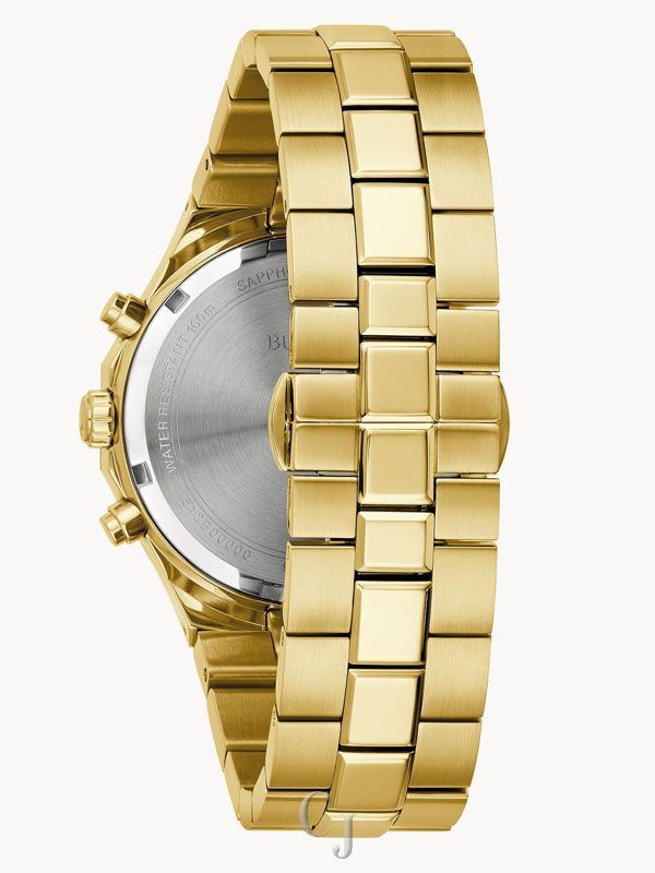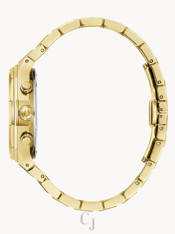 Bold, modern design characterizes this 6-hand chronograph from the Classic Bulova Prestige men’s collection. The watch features a faceted 40mm gold-tone stainless steel case with a geometric bezel, flat sapphire crystal with anti-reflective coating, 100m of water resistance, and a chamfered 3-link bracelet with a combination of brushed and polished finishes and a push-button deployant closure. The black textured dial with elegant striping has gold-tone hands and applied markers with Super-LumiNova luminescent fill, a date display, and gold-tone sub-dials including a 24-hour display. Highly functional with a distinctive design, this timepiece is suited for any occasion, from the everyday to the extraordinary.