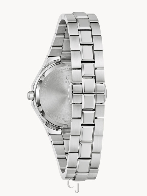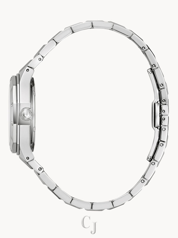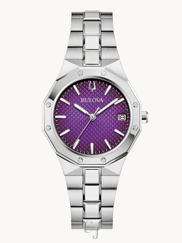 Bold, elevated design characterizes this Classic Bulova Prestige women’s timepiece that balances bold design with an elegant presence. The watch features a faceted 32mm silver-tone stainless steel case with a geometric bezel, flat sapphire crystal with anti-reflective coating, 100m of water resistance, and a chamfered 3-link bracelet with brushed and polished finishes and a push-button deployant closure. The rich purple ombre dial has a crosshatch pattern, with silver-tone hands and applied markers with Super-LumiNova luminescent fill and a date display. Striking in both its modernity and its sophistication, this Bulova ladies’ watch is an ideal companion on any wrist.