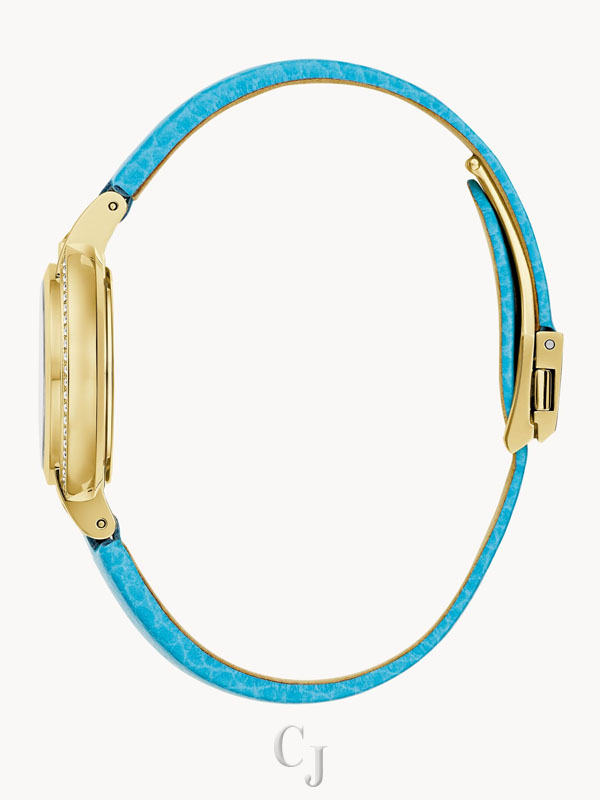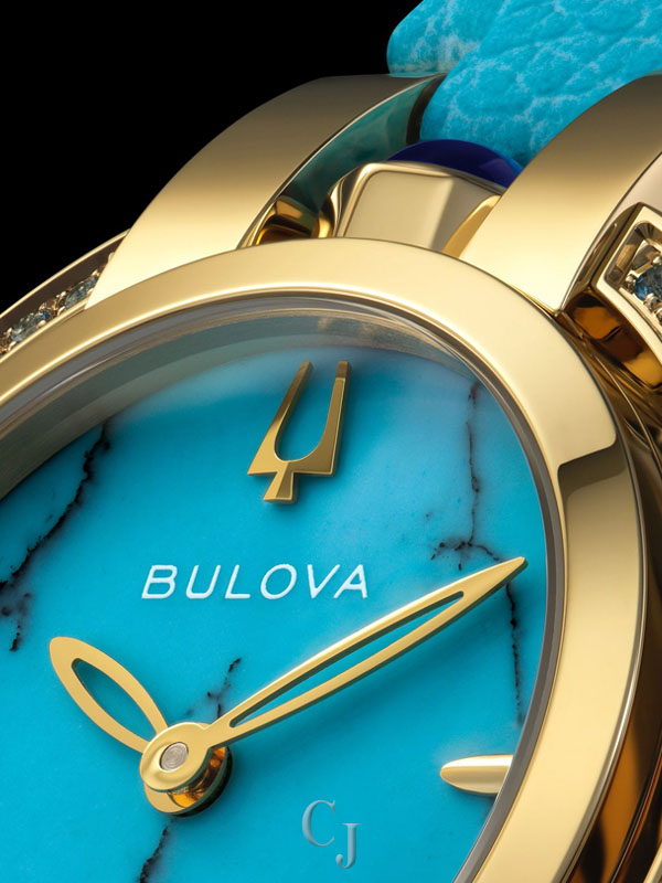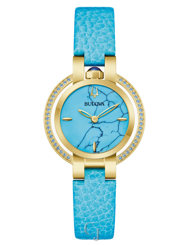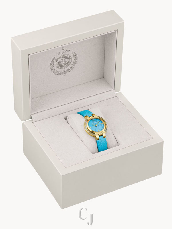 Rubaiyat is a name of poetic significance and timeless elegance. Introduced in 1917, the Rubaiyat collection marked Bulova’s debut series of timepieces designed specifically for women. Now, over a century later, and in celebration of Bulova’s 150th anniversary, the new Rubaiyat “Four Seasons” luxury collection captures the elegance of the Rubaiyat line and the true beauty of nature. The Rubaiyat “Summer” dazzles with 42 blue topaz gemstones, totaling .25 ctw, encircling its elegant gold-tone stainless steel 30mm halo case which is finished with a synthetic spinel cabochon crown . The striking dial, finished with a double-curved sapphire crystal, is carefully crafted from reconstituted turquoise, evoking crystalline tropical waters, with black striations ensuring each dial is unique. Accented with surfboard-shaped markers and paired with a matching calf grain leather strap with a custom fold-over clasp with two pushers, this luxurious women’s timepiece is a timeless addition to any collection and comes with special Rubaiyat packaging, complete with a storybook.