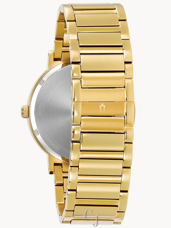 In gold-tone stainless steel with three diamonds on champagne dial, three-hand date feature, metalized edge-to-edge curved crystal, screw-back case, gold-tone stainless steel bracelet with deployment closure.