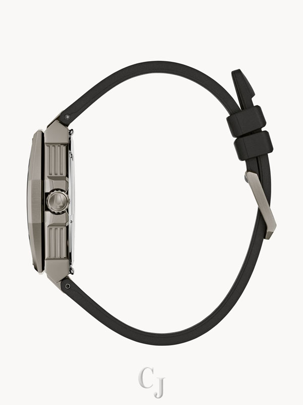 With its distinctive architectural design elements, this Bulova Series X men’s watch makes a bold first impression. The gray ion-plated stainless steel case and bracelet embody rugged, modern design while the black HNBR rubber strap features a 3-piece buckle. The white 3-hand dial with date and exhibition window is protected by a curved sapphire crystal and features a full Super-Luminova background with blue glow, contrasting with the green glow of the Super-Luminova hands and markers, glowing brightly in low-light for unrivaled utility. This luxurious contemporary timepiece is water resistant up to 100 meters and is powered by Bulova’s proprietary high-precision quartz Precisionist movement a revolutionary 8-jewel quartz mechanism accurate to seconds per year, and increased resistance to temperature changes, and with a smooth sweeping second hand. Take your precision to the next level with this innovative and stylish timepiece, fusing design and technology.