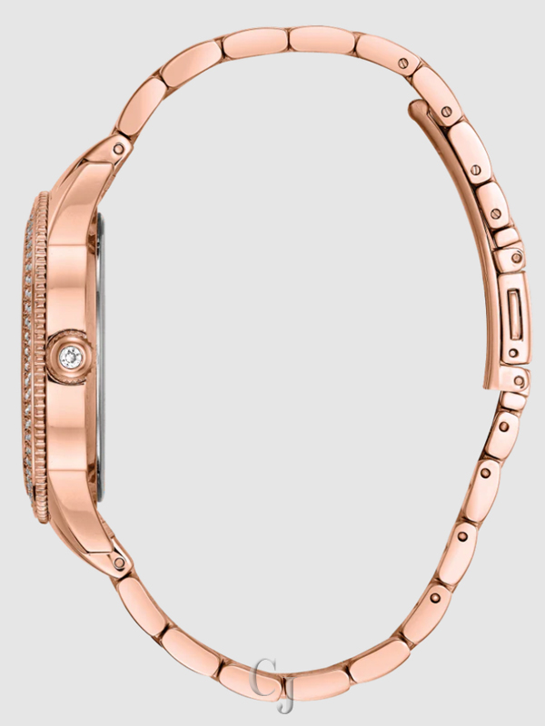 This elegant timepiece boasts a rose gold-tone stainless steel case and matching bracelet, exuding sophistication. Adorned with a fixed bezel adorned with sparkling Swarovski crystals, its silver dial features luminous rose gold-tone hands and index hour markers, with an Arabic numeral at 12 o’clock. Minute markers adorn the outer rim, while three sub-dials display the date, day of the week, and 24-hour time. Powered by quartz movement, it features a scratch-resistant mineral crystal and a solid case back. With a case size of 36mm and a thickness of 9.1mm, it offers a water resistance of 30 meters. Finished with a fold-over clasp with a push-button release, this versatile watch effortlessly combines style and functionality for any casual occasion.