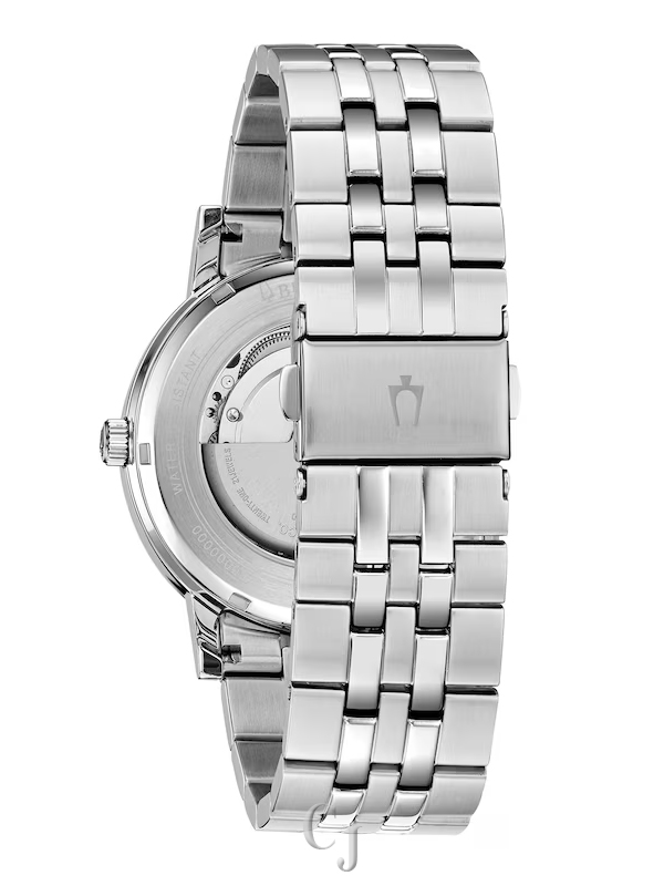The latest men’s timepiece from Bulova adopts the iconic American Clipper design, featuring a 42mm stainless steel case. It boasts an automatic self-winding movement with a generous 40-hour power reserve and a transparent case back. The watch showcases a sleek black dial adorned with markers and a day-date function, all protected by a flat mineral glass. Its stainless steel bracelet fastens securely with a push-button fold-over clasp, and it offers water resistance up to 30 meters.