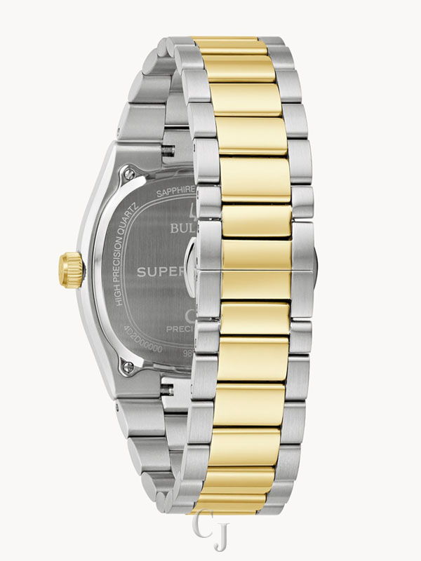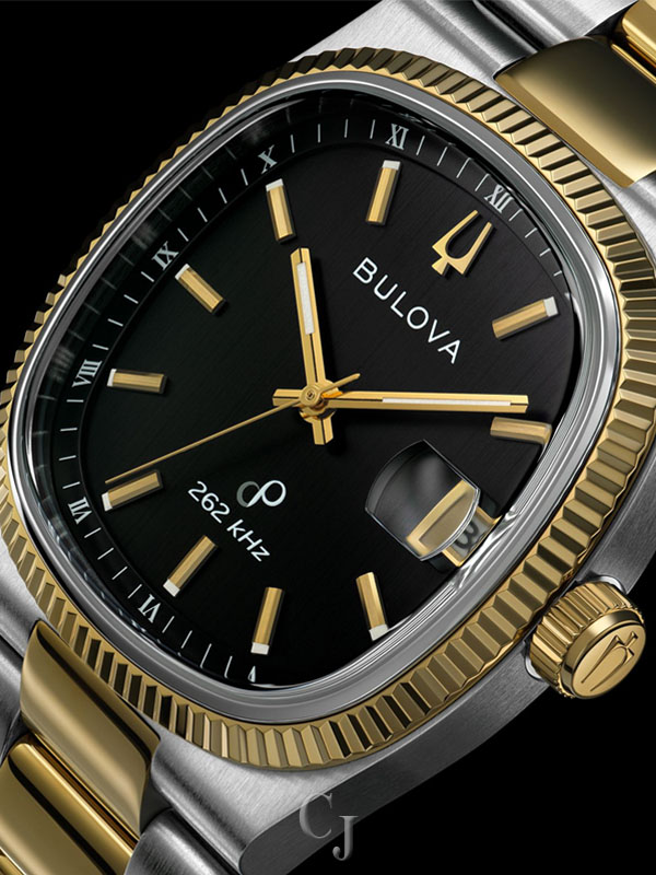 Drawing inspiration from the incredible Bulova Super Seville Day-Date of the 1970s, the men’s Bulova Super Seville merges retro aesthetics with state-of-the-art movement technology for a timeless modern appeal. With versatility for every style, the gold- and silver-tone stainless steel 38mm case strikes a bold stance with a seamless silhouette created by the TV-shaped case transitioning into the integrated 3-link two-tone stainless steel bracelet, which features a push-button deployant clasp. An elegant, grooved coin edge bezel enhances the case and surrounds a flat sapphire crystal and its date magnifier. The compelling dial is a rich brushed black, with polished gold-tone hands and indices and a date situated perfectly at 3 o’clock. The new Bulova Super Seville is powered by our proprietary high-precision quartz Precisionist movement, a revolutionary 8-jewel quartz mechanism vibrating at a remarkable 262kHz, accurate to seconds per year with increased resistance to temperature changes, and with a smooth sweeping second hand. Embrace an effortless kind of elegance with the men’s Bulova Super Seville.
