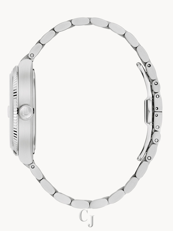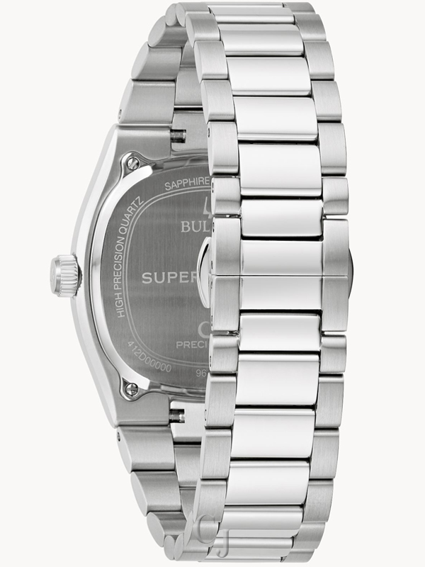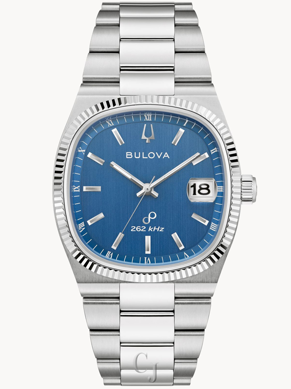 Drawing inspiration from the incredible Bulova Super Seville Day-Date from the 1970s, the new Super Seville merges retro aesthetics with state-of-the-art Precisionist technology for a timeless modern appeal. The silver-tone stainless steel 38mm case has the versatility to be worn by most anyone and makes a bold statement with a seamless silhouette created by the retro TV-shaped case transitioning into the integrated 3-link stainless steel bracelet, which features a secure and convenient push-button deployant clasp. An elegant, grooved coin edge bezel enhances the case and surrounds the flat sapphire crystal and its date magnifier. The compelling dial is a deep vertical brushed blue, with polished hands and indices and a date situated perfectly at 3 o’clock. The new Bulova Super Seville is powered by our proprietary high precision quartz Precisionist movement, a revolutionary 8-jewel quartz mechanism vibrating at a remarkable 262kHz, accurate to seconds per year with increased resistance to temperature changes, and with a smooth sweeping second hand. Embrace an effortless kind of elegance with the men’s Bulova Super Seville.