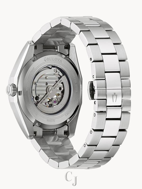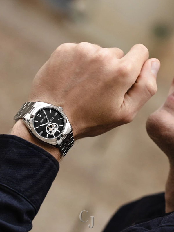 Part of the Surveyor line of Bulova watches, this updated classic automatic watch offers all of the detail and fine quality you would expect in a luxury watch, at an accessible price. The silver-tone stainless steel case and bracelet is paired with a rich black dial with silver-tone accents and an open aperture to view the movement’s balance wheel and escapement. The screw-back case is topped with a mineral crystal exhibition window to showcase the automatic movement powering the timepiece. This beautifully detailed, quality timepiece is destined to become a new favorite in any collection.