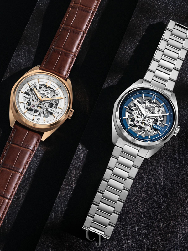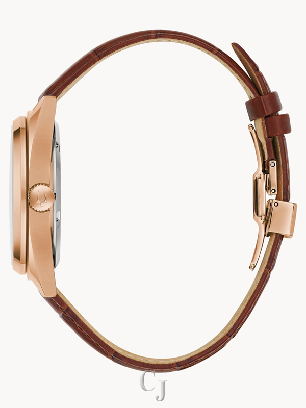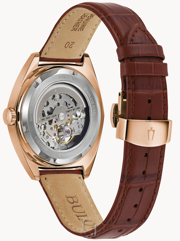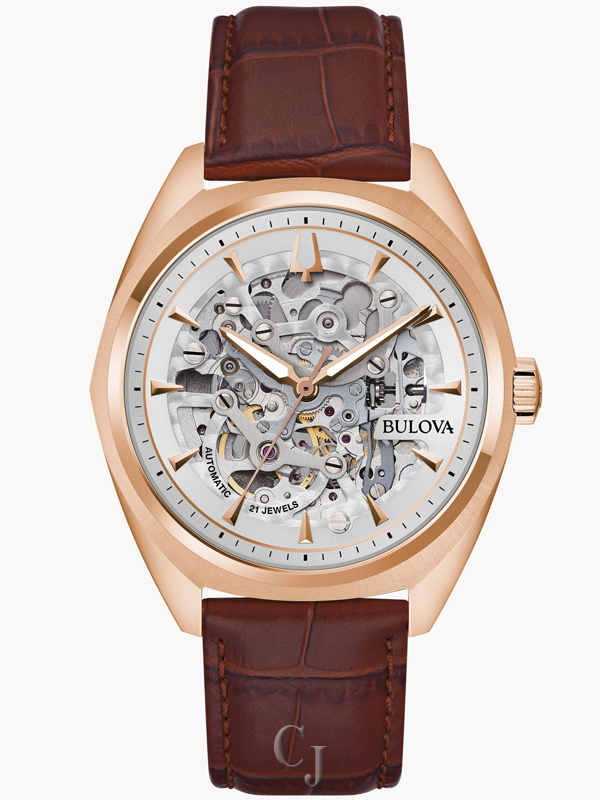 This new men’s automatic timepiece from the Bulova Surveyor collection offers modern elegance and luxurious craftmanship at an exceptional price. The contemporary rose gold-tone stainless steel case delivers an eye-catching blend of brushed and polished surfaces with a subtle angularity and a domed mineral crystal. The remarkable dial is highlighted by the stunning display of the skeletonized automatic 21-jewel movement, which features a 42-hour power reserve. Surrounding the dial is a silver white chapter ring with rose gold-tone applied hour indices, which is complemented by matching angular hands with luminescent fill. The watch is paired with a refined brown leather strap with a 3-piece closure for an ideal fit. Step out in stylish sophistication with this new Bulova men’s timepiece.