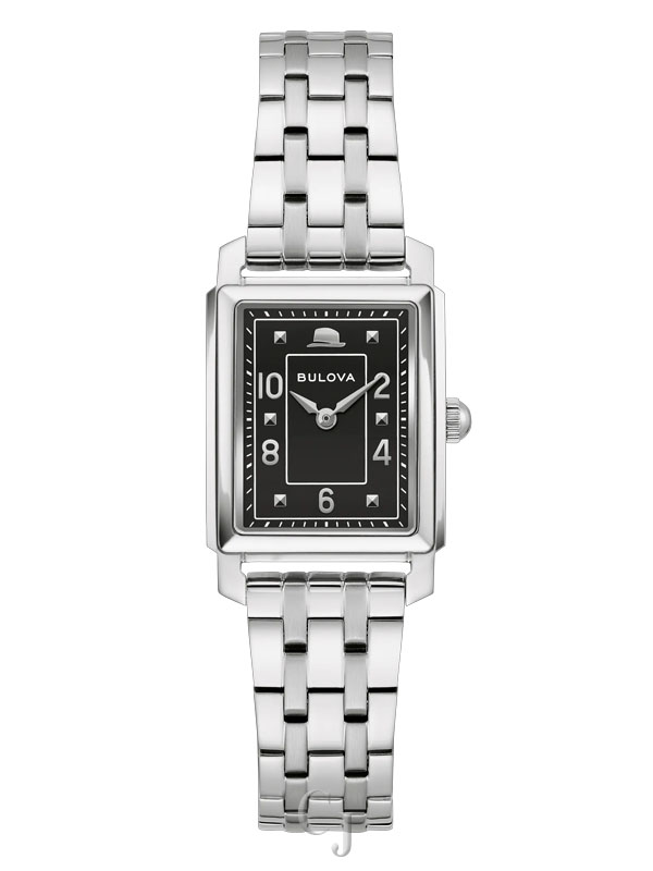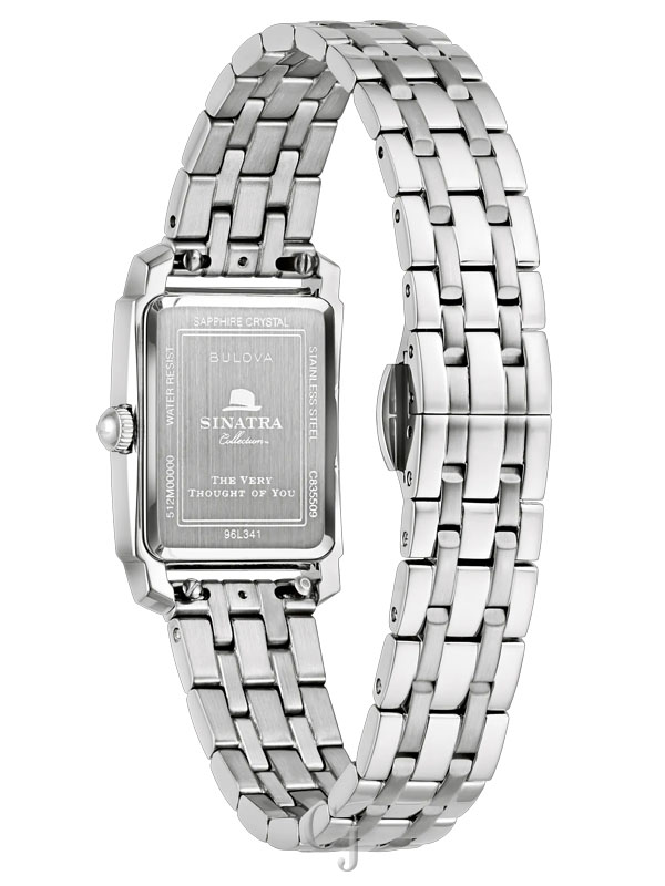 This enduring design from Bulova’s Frank Sinatra collection is inspired by classic Bulova model from the legendary crooner’s heyday. The watch features a 21mm silver-tone stainless steel case with a curved sapphire crystal with anti-reflective coating, a case back engraved with the Sinatra logo and “The Very Thought of You,” and a matching 7-row bracelet with a push-button deployant clasp. The radiant black dial is appointed with a date display and silver-tone hands and applied markers, including Sinatra’s signature fedora at 12 o’clock. As classic as Sinatra himself, this Bulova ladies’ watch offered in a custom Frank Sinatra box is a timeless addition with style that will last a lifetime.