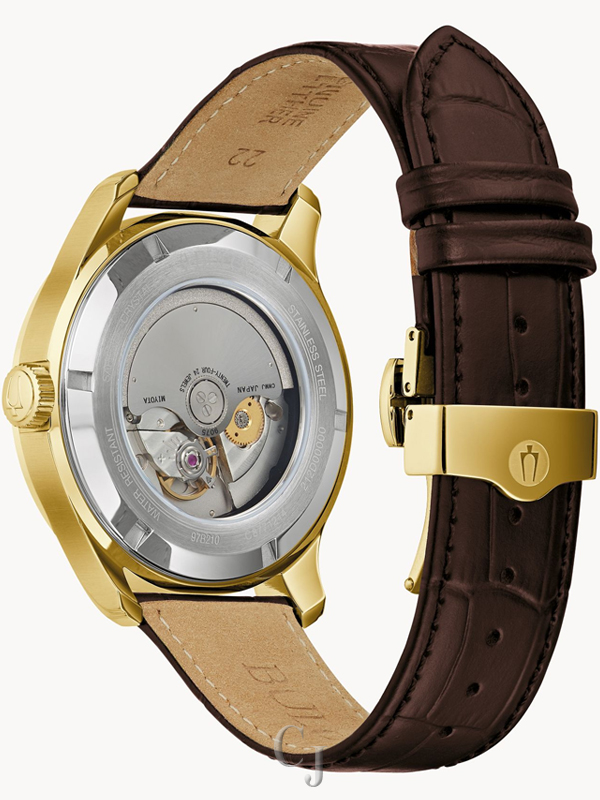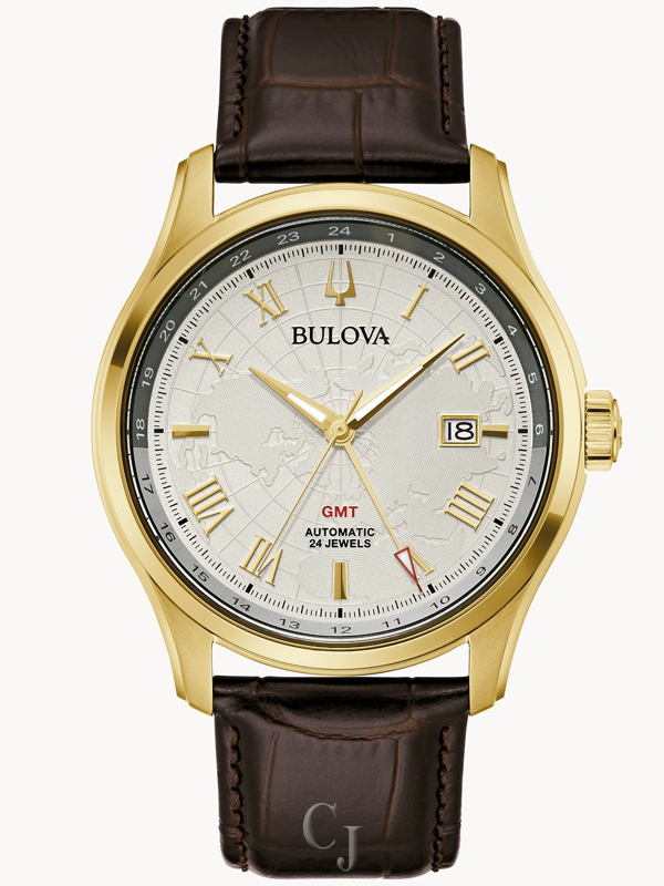 Timeless elegance is effortlessly combined with advanced GMT function in the luxurious, new Wilton Automatic timepiece from the Bulova Classic collection. This traditionally styled watch features an innovative, new automatic movement with the ease of setting the hour hand to another time zone without affecting the accuracy while traveling anywhere in the world – and the dual time can be read at glance. The sophisticated design of the gold-tone stainless steel case showcases a lustrous silver-white 4-hand GMT dial with a calendar, Roman numeral markers, and an anti-reflective, domed sapphire crystal. The GMT hand’s luminous tip is bordered in a tone to match the color of the “GMT” printed on the dial and works with the bi-colored dial ring with a 24-hour indication to mark the 2nd time zone. The dial features a World Map with the land area raised in a cd groove texture with latitude and longitude coordinates also raised over the sea. The brown embossed alligator grain leather strap with tone-on-tone stitching, nubuck lining and double-press deployant buckle closure completes the richly elegant feel. This watch’s self-winding 24 jewel automatic movement ensures optimal performance and features a 42-hour power reserve making it the ultimate timepiece for world travelers and fine watch enthusiasts alike. Water resistant to 30 meters.