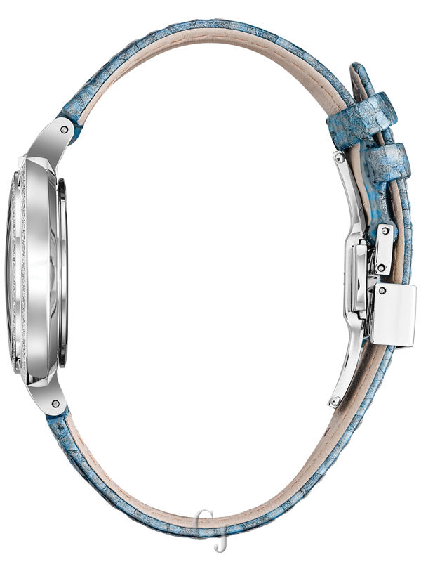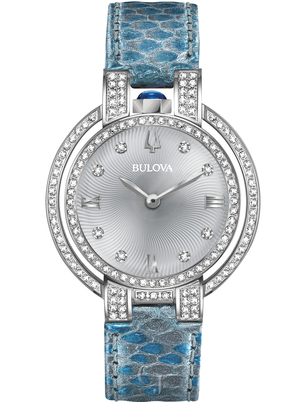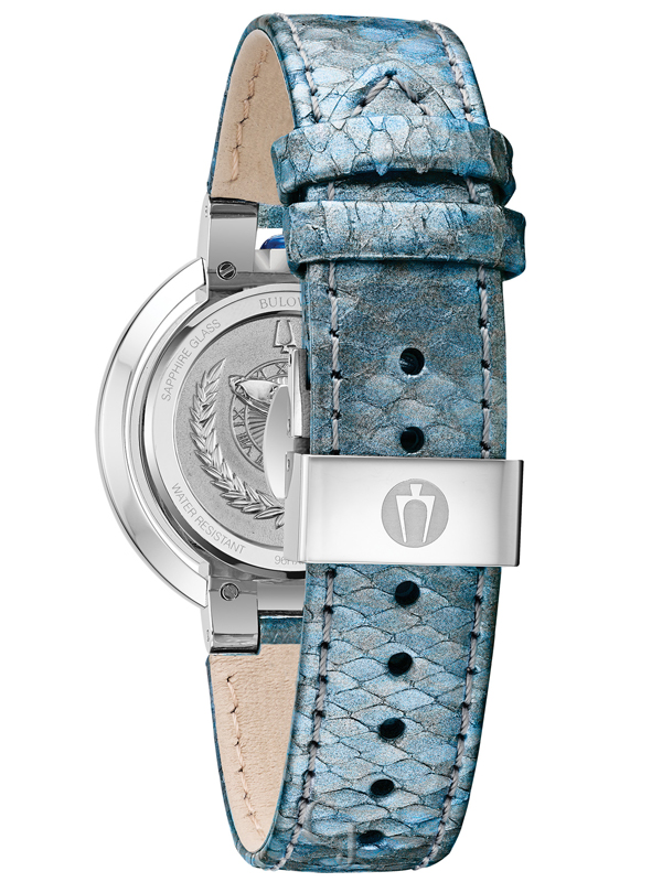 Bulova Rubaiyat Collection. Watch model 96R223. Quartz movement. Stainless steel case with 50 hand set diamonds and synthetic blue spinel cabochon crown at 12 o’clock position. Blue textured dial with diamond markers. Blue color genuine python leather strap. Iconic dye struck “Goddess of Time” dimensional case back