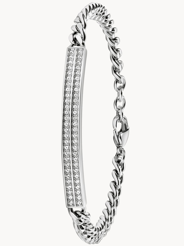 Add sparkle to your style with this Classic collection gift set. The timepiece includes a white sunray dial with a calendar window at 3 o’clock, a silver-tone stainless steel case with 60 crystals on the bezel, and a polished silver-tone stainless steel bracelet. A silver-tone stainless steel jewelry bracelet completes the gift set with 56 crystals set on the center plate and a lobster claw closure.