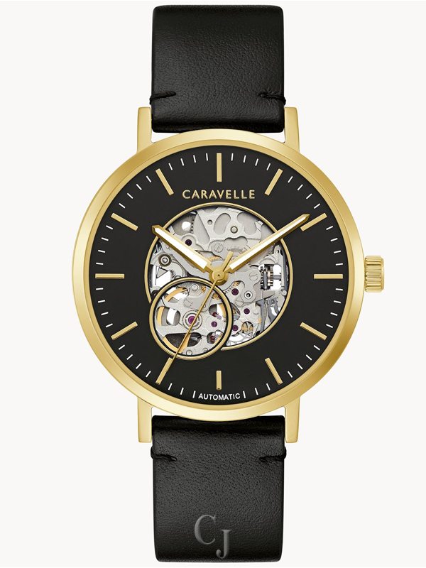 Gold-tone stainless steel case features an open aperture black sunray dial and gold-tone hands and markers. Exhibition screw-back case offers a glimpse of the 21-jewel automatic skeletonized movement. The black leather strap is finished with a self-color safety stitch.