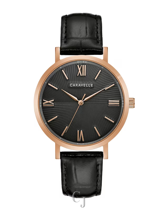This Caravelle by Bulova men’s watch boasts a sleek design with a black dial adorned with rose-toned hands and Roman numeral markers. The face features a textured quadrant design and is protected by a mineral crystal, all encased in a 40.0mm rose-toned stainless steel case. The reliable Japanese quartz movement guarantees precise timekeeping. Securing the watch is a black leather strap with a crocodile pattern and a buckle clasp. With a water resistance of up to 30 meters, this timepiece comes with a three-year limited manufacturer warranty, and we are an authorized Caravelle by Bulova dealer.