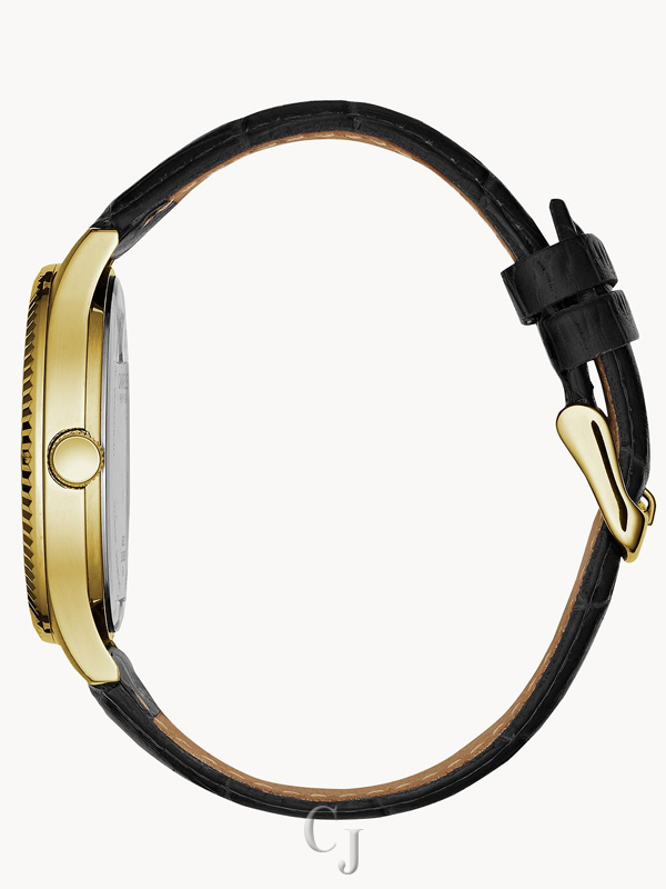 Sleek and streamlined in stainless steel with gold finish, serrated-edge bezel, black dial, luminous hands, calendar, second hand, and black leather strap.