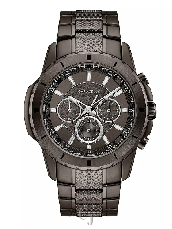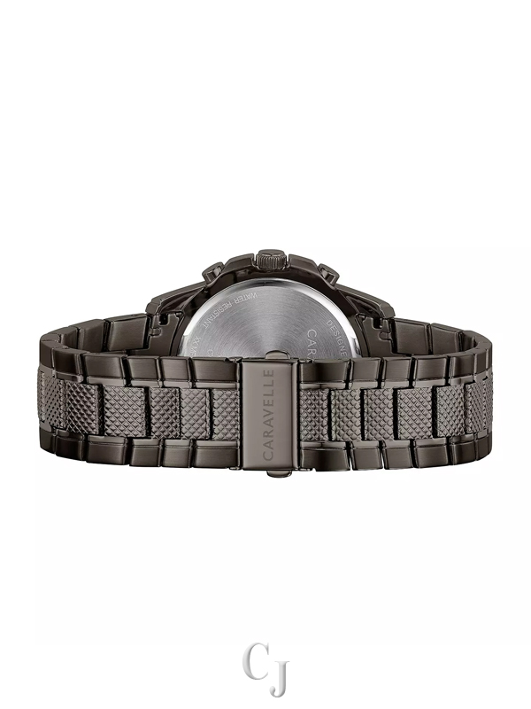 This Caravelle by Bulova men’s watch showcases a gunmetal dial complete with three chronograph sub-dials, luminous hands, and markers, all housed in a 44.0mm gunmetal ion-plated stainless steel case. Its dependable Japanese quartz movement ensures precise timekeeping. The gunmetal ion-plated stainless steel link bracelet is secured with a double-press fold-over clasp. With water resistance up to 30 meters, this watch is backed by a three-year limited manufacturer warranty. As an authorized Caravelle by Bulova dealer, we guarantee its authenticity.