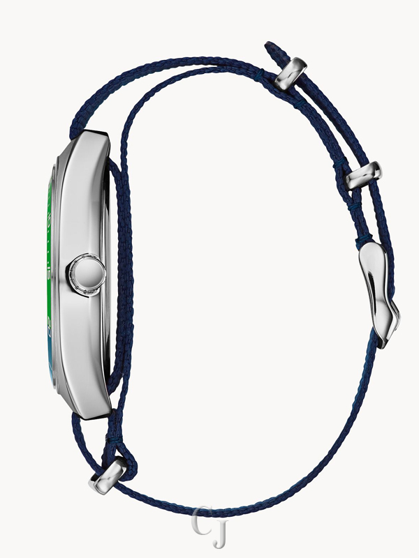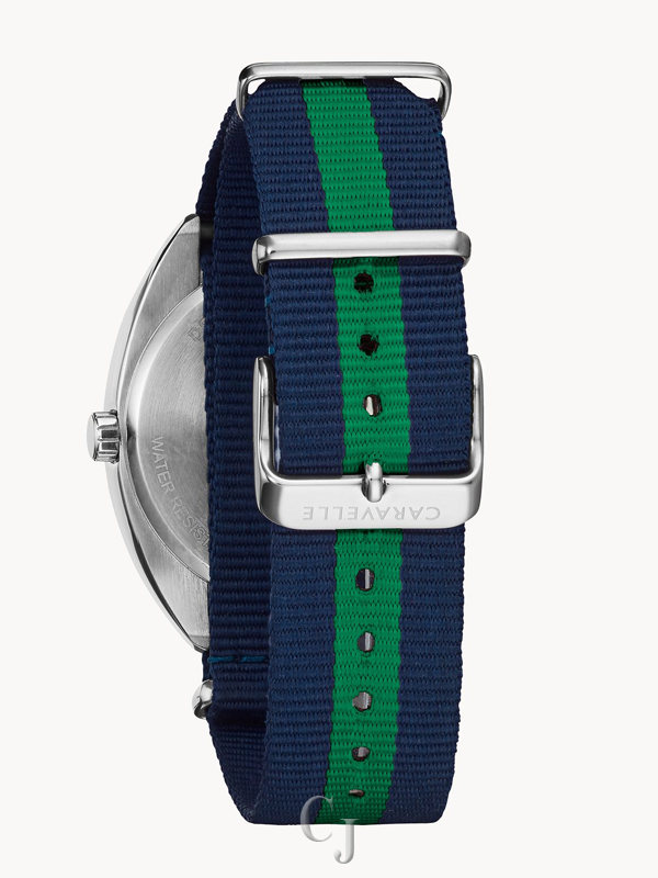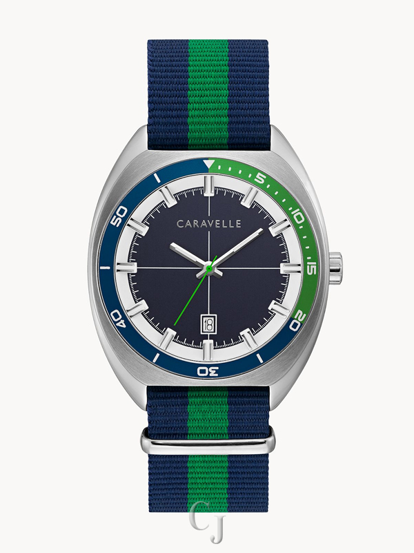 Styled for today with a retro vibe. Bi-colored bezel of navy & green matches the sophisticated striped NATO strap with silver-tone sliding clasp and buckle closure. Two-tone brushed and polished stainless steel case. Navy matte textured dial boasts fine cross-hair detail, date feature at 6 o’clock and luminous hands with green seconds hand.