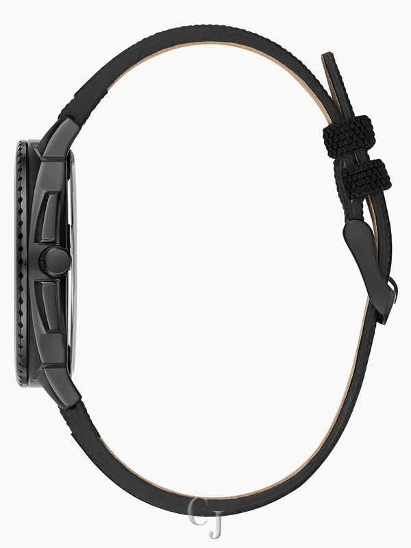 Go tough on style. Bold black multilayered dial with a carbon-fiber weave pattern on inner core sets off raised dimensional hour markers outlined in green and a date feature at 6 o’clock. Cushion shaped black IP stainless steel case, and black nylon/leather strap green-stitched accents and wire buckle closure.