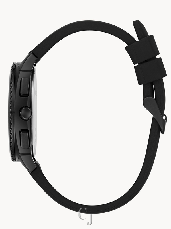 Texture and dimension with a pop of color. Black stainless steel cushion shaped case with a multi-layered black dial topped off with a carbon fiber textured inner zone. Blue dial accents with raised dimensional hour markers. Dual time multifunction. Black leather strap with three-piece wire closure.