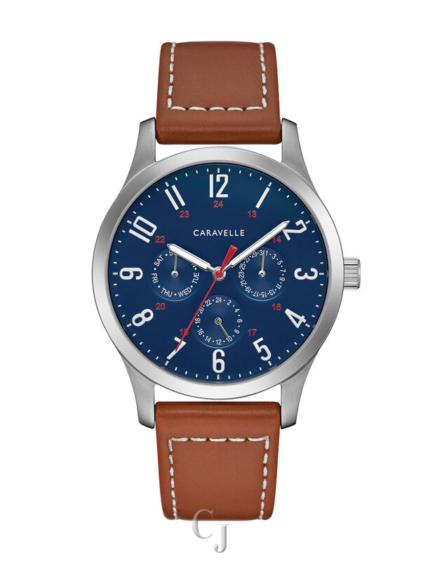 Enhance your daily style with this timepiece. Crafted with a stainless steel case, it boasts a rich blue dial adorned with easily readable white Arabic numeral indexes, complemented by vibrant red accents and a matching second hand. The watch features a versatile six-hand multifunction movement and is secured with a robust brown leather strap, accentuated by contrasting stitching and a three-piece wire closure. Sized at 40mm, it adds a touch of sophistication to your wrist.