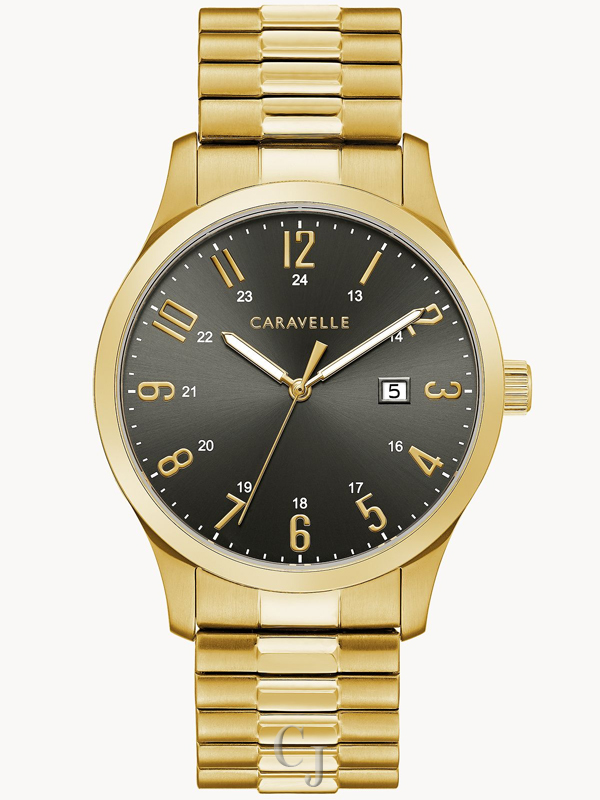 An easy to wear every day style. Gold-tone stainless steel case and bracelet with a gray dial. Gold-tone markers and hands on the dark dial make for an easy to read style. Mineral crystal. Expansion bracelet makes for easy wear.