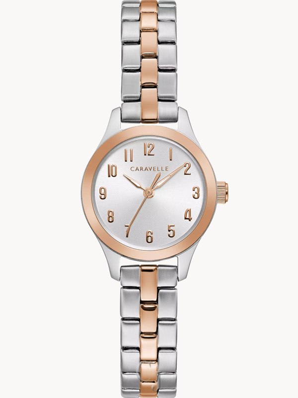 Less is more with this gracefully proportioned rose gold-tone accented stainless steel case with easy-to-read numerals on silver-white sunray dial. Alternating polished and brushed three-link stainless steel bracelet with rose gold-tone accents and jewelers clasp closure.