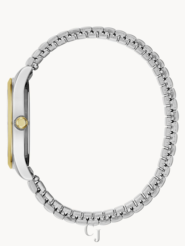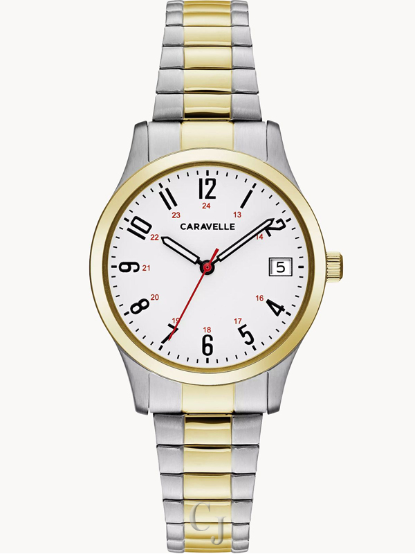 Timeless design, wear-with-everything style. Complete with easy-to-read numerals with 24-hour design and three-hand date feature. Gold-tone accents on stainless steel case and comfort-fit expansion bracelet are the finishing touches on this classic watch.