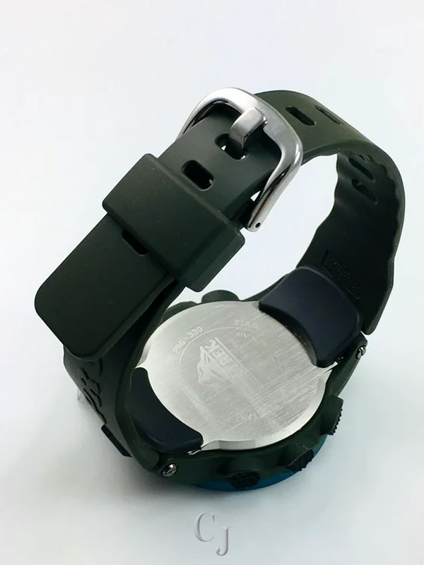 The Casio PRG-330-2A is a robust outdoor adventure watch that packs a powerful punch with its Triple Sensor technology, including an altimeter, barometer, and digital compass. Designed for outdoor enthusiasts and adventurers, it provides altitude measurements ranging from -700 meters to 10,000 meters, automatic logging of high and low altitudes, and trek log data for specific excursions. The digital compass displays direction in 16 points, features continuous measurement for 60 seconds, and offers calibration functions. Additionally, the watch includes a barometer to track atmospheric pressure changes, a thermometer for temperature readings, LED backlighting, world time functionality, sunrise/sunset data, alarms, a stopwatch, and a countdown timer. Powered by a solar rechargeable battery, this timepiece is not only feature-rich but also environmentally friendly, ensuring it remains reliable during extended outdoor adventures. With a durable design, it’s water-resistant up to 100 meters and equipped to handle the rigors of outdoor exploration.
