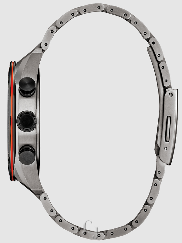 Other advanced features include a direct flight world time function, a perpetual calendar with day and date indicators, 1/20 second chronograph measures up to 60 minutes, 12/24-hour timekeeping, and a power reserve display. Featuring light-powered Eco-Drive Atomic Timekeeping functionality, the timepiece self-adjusts to time or calendar when traveling overseas by receiving local time signals in four different regions for 26 time zones. Water resistant up to 100 meters. Caliber H800.